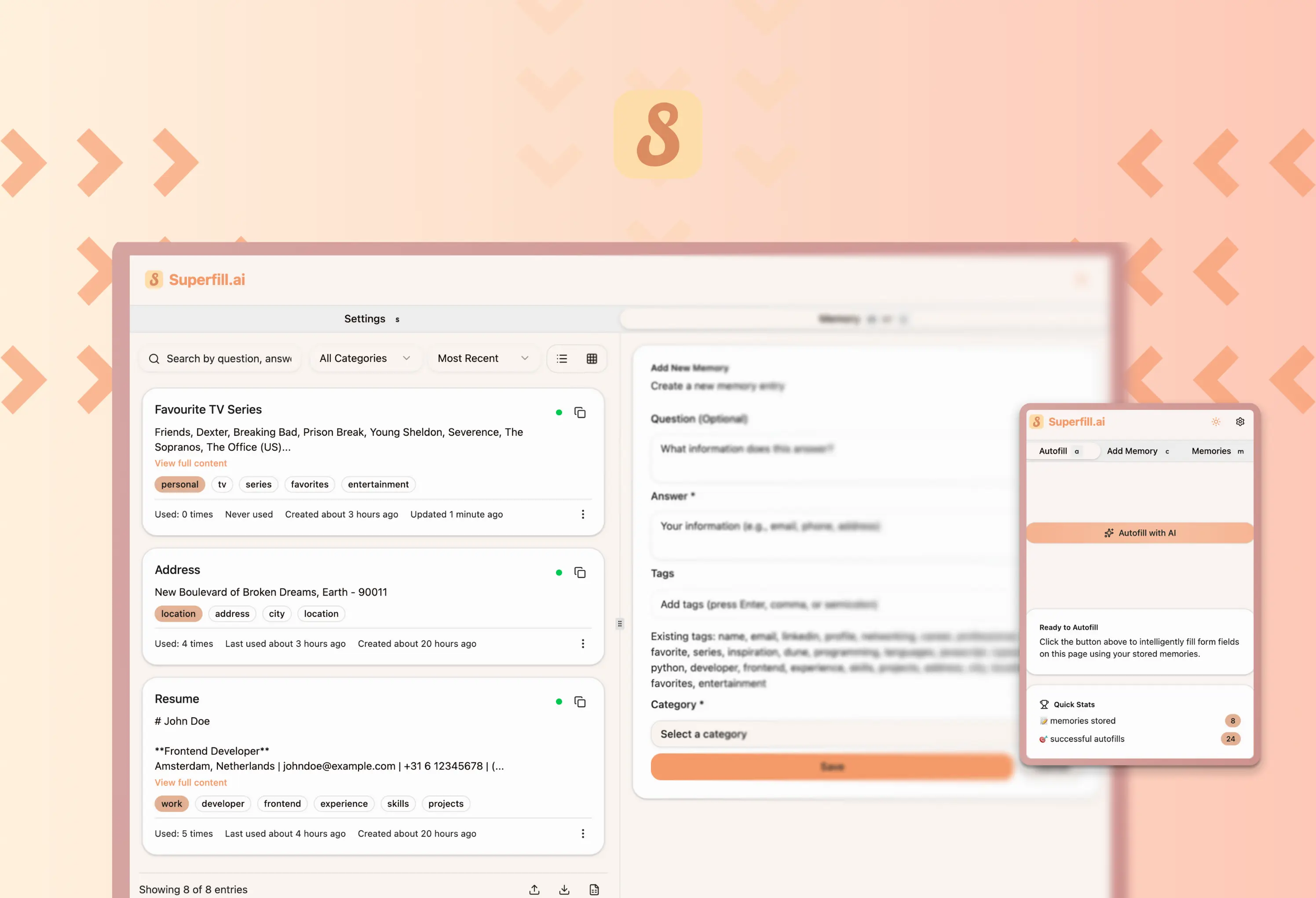 Create your personal memory bank with all your information—work history, skills, preferences, contact details. Add it once, and Superfill remembers it forever.